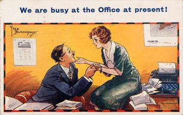 Illustrierte Postkarte; Grafik, polychrom; Nr. 2345, Grafik: Fred Buchanan Rückseite: Vorgesetzter und Sekretärin mit Schreibmaschine in romantischer Büroszene Vorderseite: beschrieben; adressiert an Miss Wright, Scotland; Briefmarke Postage Revenue (U.K.) One Penny; Poststempel Aberdeen/25 Jul 1934