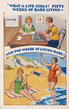 Illustrierte Postkarte; Grafik, polychrom; Comic Series Nr. 3065 Rückseite: zwei Frauen/Sekretärinnen im Büro mit Schreibmaschine und im Urlaub am Strand; weiterer Text: Fifty weeks of bare living - and two weeks of living bare! Vorderseite: beschrieben; adressiert an Mrs Vines, London; Briefmarke Postage Revenue (U.K.) One Penny; Poststempel Margate/15 Aug 1930