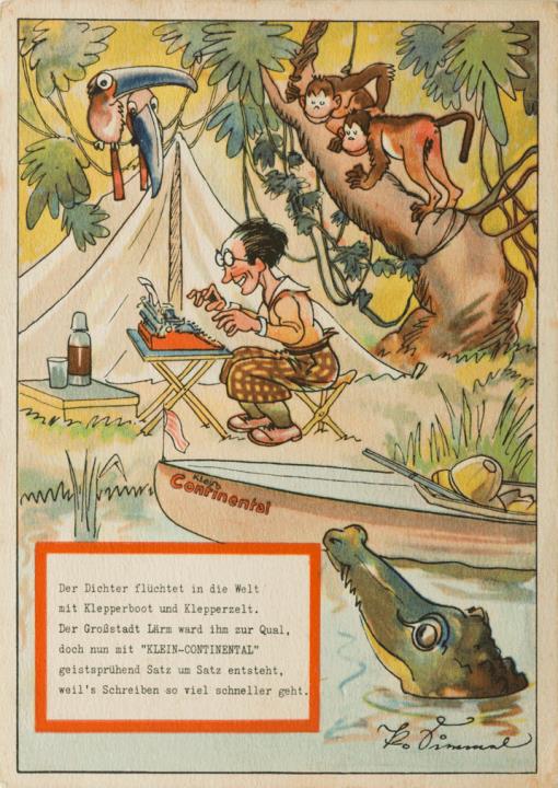 Werbepostkarte; Grafik, polychrom; Nr. C 6090 Rückseite: Mann im Urwald mit Schreibmaschine Klein-Continental; Kartusche mit Werbetext in Versform Vorderseite nicht beschrieben