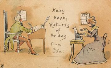 Illustrierte Postkarte; Grafik, polychrom Rückseite: Mann am Schreibpult (Kalender 1801), Sekretärin mit Schreibmaschine (Kalender 1901); Leerraum beschrieben Vorderseite: adressiert an Miss Koenigsfeld, Bruxelles; Briefmarke Postage Revenue (U.K.) One Penny; Poststempel West Norwood/Ap 3 1902, Bruxelles/4 Avril 1902