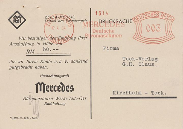 Postkarte; monochrom Vorderseite: vorgedruckter Text; adressiert an Firma Teck-Verlag, Kirchheim Absenderfreistempel: datiert Zella-Mehlis/17.4.1934, Werbung Mercedes Deutsche Büromaschinen, Wert Deutsches Reich 3 RPf. Rückseite nicht beschrieben