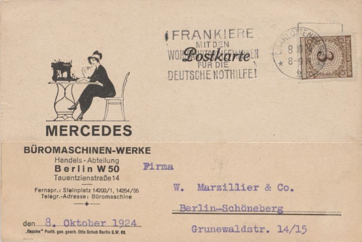 Klebepostkarte mit Werbebild; Grafik, monochrom Vorderseite: Werbung Mercedes; adressiert an Firma Marzillier & Co., Berlin; Briefmarke Deutsches Reich 3 RPf.; Poststempel Charlottenburg/8.10.1924 Rückseite beschrieben (Maschinenschrift)