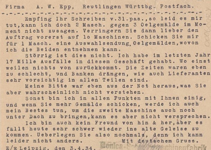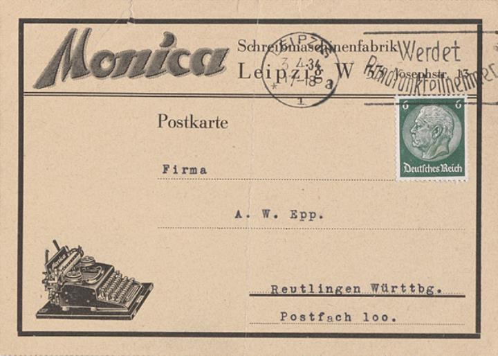 Postkarte mit Firmendruck; Grafik, monochrom Vorderseite: adressiert an Firma A.W. Epp., Reutlingen; Briefmarke Deutsches Reich 6 RPf., Poststempel Leipzig/3.4.1934 Rückseite beschrieben (Maschinenschrift)