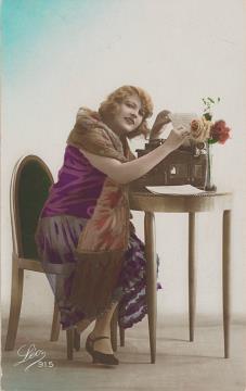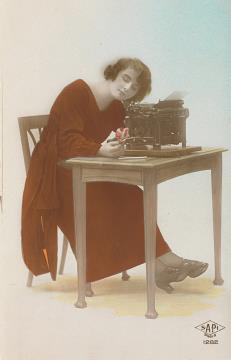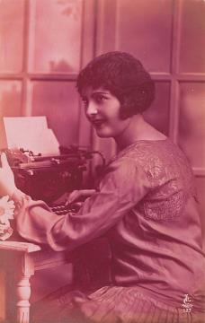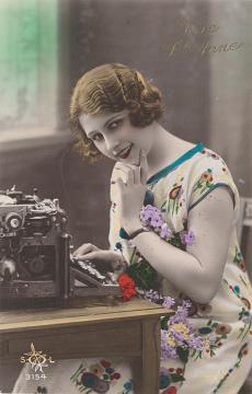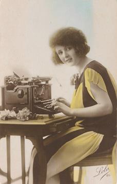 Illustrierte Postkarte; Fotografie, koloriert; Serie Sapi Paris 1282 Rückseite: Frau mit Schreibmaschine, Blick zum Betrachter Vorderseite beschrieben