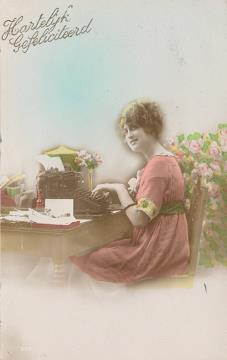 Illustrierte Postkarte; Fotografie, koloriert; Serie M 295 Rückseite: Frau mit Schreibmaschine, Blumen als Dekoration Vorderseite: beschrieben, adressiert; Briefmarke Nederland 2 Cent; Poststempel Amsterdam/3 VI 1926