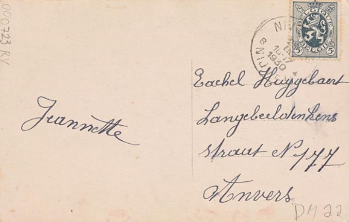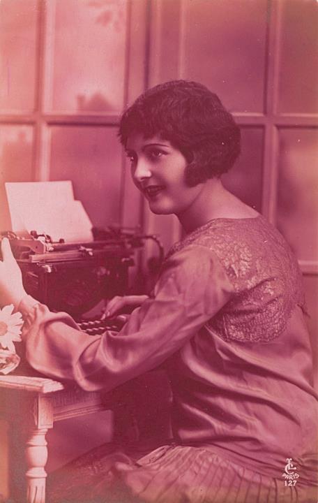 Illustrierte Postkarte; Fotografie, getönt; Serie LC Paris 127 Rückseite: Frau mit Schreibmaschine, Blumen als Dekoration Vorderseite beschrieben, adressiert; Briefmarke Postes Belgique 5c; Poststempel 29 xx 1930