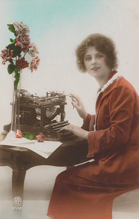 Illustrierte Postkarte; Fotografie, koloriert; Serie RP 1598 Rückseite: Frau mit Schreibmaschine, Blick zum Betrachter, Blumen als Dekoration Vorderseite beschrieben