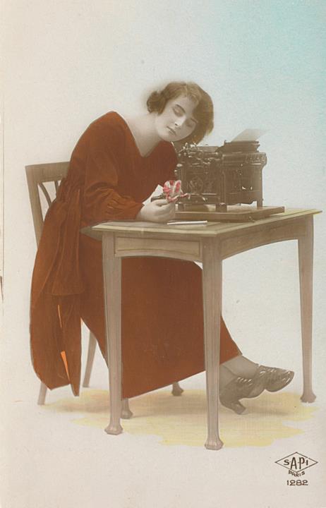 Illustrierte Postkarte; Fotografie, koloriert; Serie Sapi Paris 1282 Rückseite: Frau mit Blume und Schreibmaschine Vorderseite nicht beschrieben