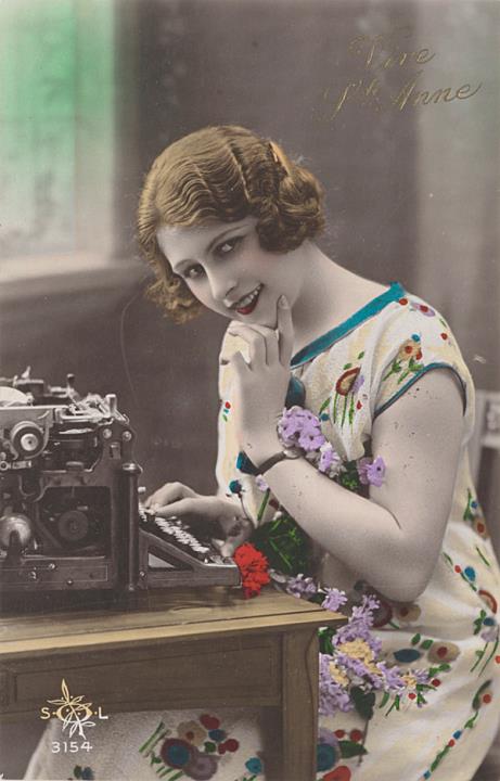 Illustrierte Postkarte; Fotografie, koloriert; Serie SOL 3154 Rückseite: Frau mit Schreibmaschine, Blumen als Dekoration Vorderseite beschrieben
