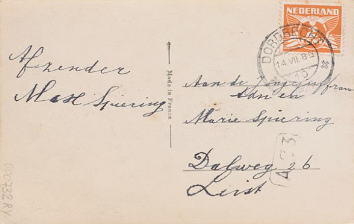 Illustrierte Postkarte; Fotografie, koloriert; Serie Lola 16 Rückseite: Frau mit Schreibmaschine, Blick zum Betrachter, Blumen als Dekoration Vorderseite: beschrieben, adressiert; Briefmarke Nederland 2 Cent; Poststempel Dordrecht/14 VII 1927