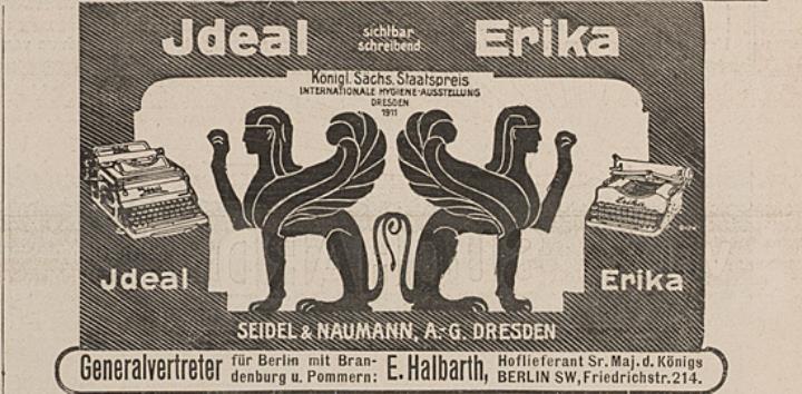 Zeitungsblatt (Berliner Illustrirte Zeitung) Werbeanzeige für Schreibmaschine Ideal und Erika monochrom