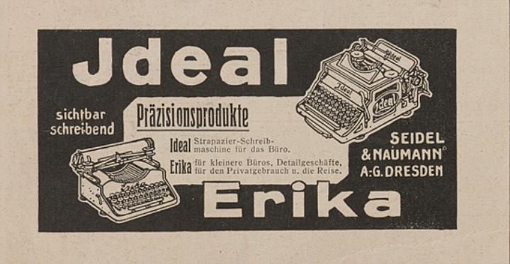 Zeitungsblatt (Berliner Illustrirte Zeitung) mit Werbeanzeige für Schreibmaschine Ideal und Erika monochrom