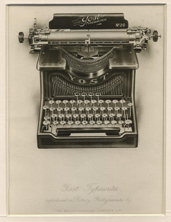 Werbebild für Schreibmaschine Yost 20 monochrom; mit Passepartout weiterer Text: reproduced in Rotary Photogravure by the Mezzogravure Company Ltd.