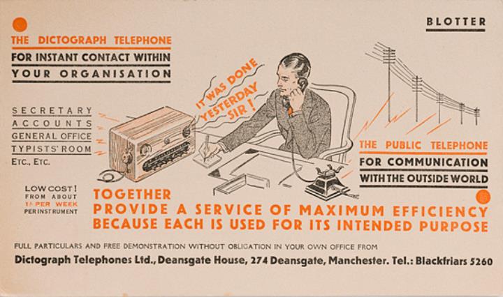 Löschpapier mit Werbedruck der Firma Dictograph Telephones Ltd., Manchester