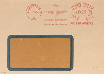 Vorderseite eines Briefumschlags mit Absenderfreistempel der Adlerwerke, Frankfurt; Nr. 1204 Stempel: Frankfurt am Main/6.4.1936, Werbung Adler Favorit, Wert Deutsches Reich 12 RPf.