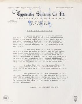 Begleitbrief zu Ersatzteilkatalog der Typewriter Sundries Co. Ltd., London Maschinenschrift; nicht datiert Briefbogen mit Wasserzeichen "British Bond"