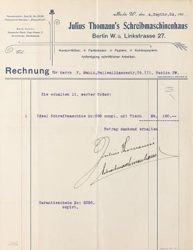 Rechnung der Firma Julius Thomann, Berlin adressiert an Herrn Mahlo, Berlin SW; datiert 04.09.1904 Maschinenschrift, unterschrieben Briefbogen mit Wasserzeichen "Superfine Diamand Post"