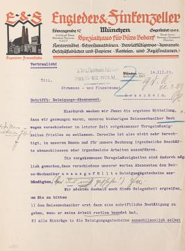 Brief der Bürowarenhandlung Engleder & Finkenzeller, München adressiert an Titl. Strassen- und Flussbauamt Rosenheim; datiert 14.3.1923 Maschinenschrift, Unterschriftstempel
