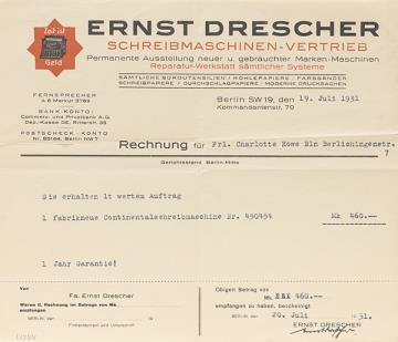 Rechnung der Firma Ernst Drescher, Berlin adressiert an Frl. Charlotte Howe, Berlin; datiert 19.06.1931 Maschinenschrift, unterschrieben Briefbogen mit Wasserzeichen (Flugzeug und "Eilpapier")