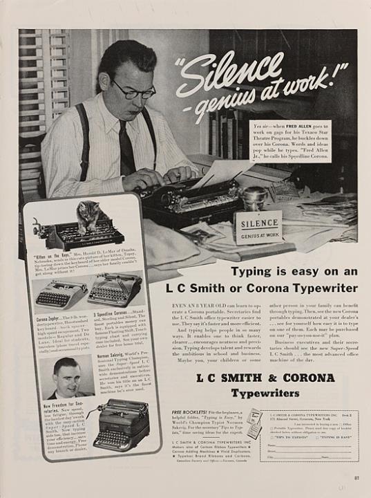 Werbeanzeige für Schreibmaschinen L. C. Smith und Corona monochrom