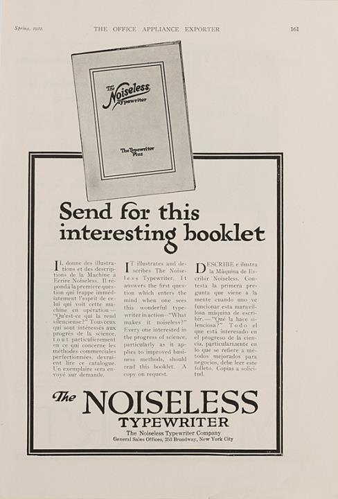 Zeitschriftenblatt (The Office Appliance Exporter) mit Werbeanzeige für Schreibmaschine Noiseless monochrom