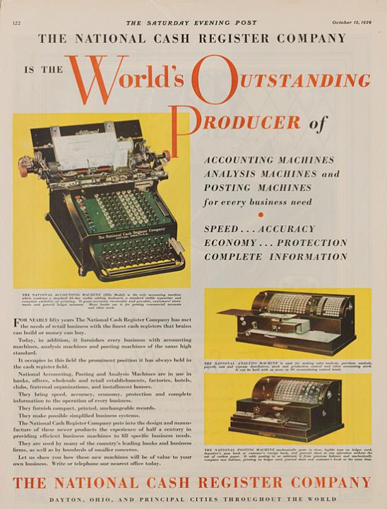 Zeitungsblatt (The Saturday Evening Post) mit Werbeanzeige für Rechenmaschinen National polychrom; mit Passepartout