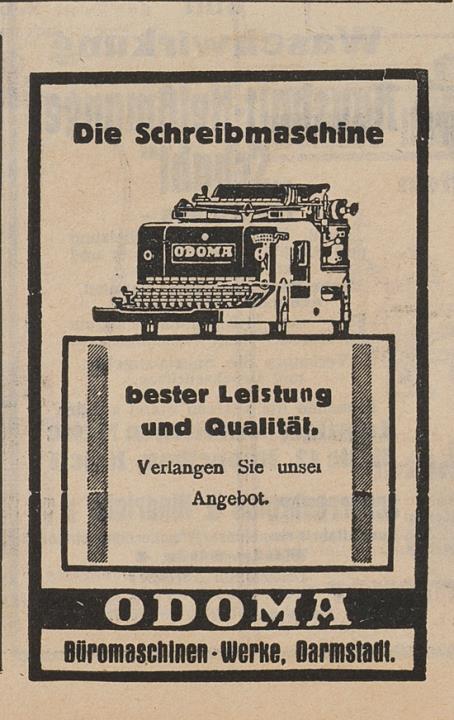 Zeitungsblatt (Elektrotechnischer Anzeiger) mit Werbeanzeige für Schreibmaschine Odoma monochrom