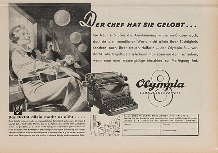 Zeitungsblatt (Berliner Illustrirte Zeitung) mit Werbeanzeige für Schreibmaschine Olympia 8 monochrom