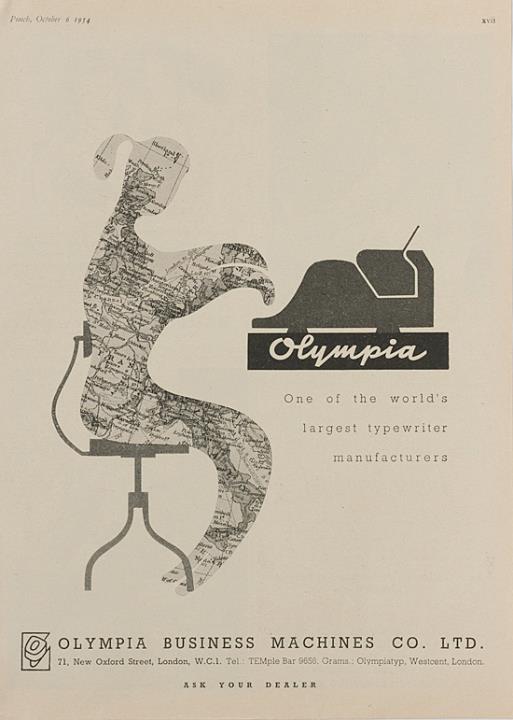 Zeitungsblatt (Punch) mit Werbeanzeige für Schreibmaschine Olympia monochrom