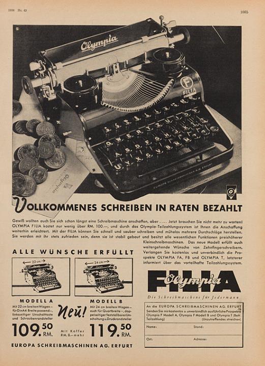 Werbeanzeige für Schreibmaschine Olympia Filia F monochrom