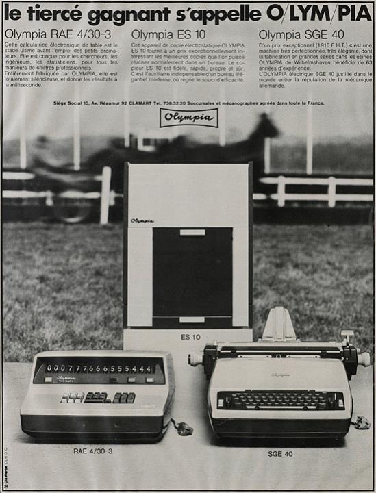 Werbeanzeige für Schreibmaschine SGE 40, Rechenmaschine Olympia RAE 4/30-3 und Kopiermaschine Olympia ES 10 monochrom; mit Passepartout