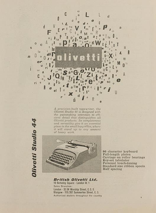 Werbeanzeige für Schreibmaschine Olivetti Studio 44 monochrom