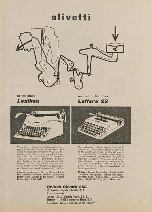 Werbeanzeige für Schreibmaschine Olivetti Lexikon und Lettera 22 monochrom