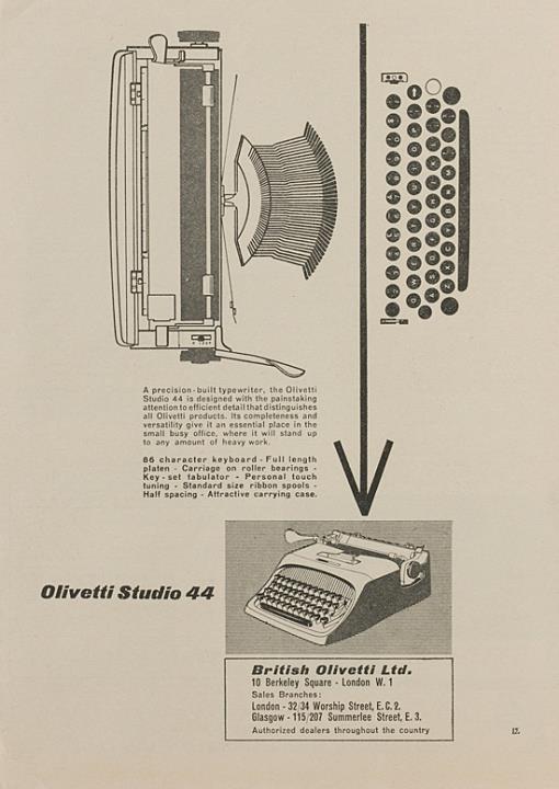 Werbeanzeige für Schreibmaschine Olivetti Studio 44 monochrom