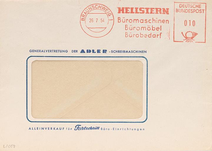 Briefumschlag mit Firmendruck und Absenderfreistempel der Firma Hellstern Stempel: Braunschweig/26.07.1954, Wert Deutsche Bundespost 10 Pf.