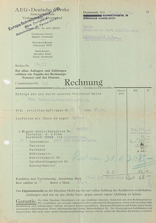 Rechnung Nr. 330/II der Europa Schreibmaschinen A.G. (vormals AEG-Deutsche Werke), Dortmund adressiert an Herrn Schliebener, Lüdenscheid; datiert 17.07.1930 Maschinenschrift, Handschrift