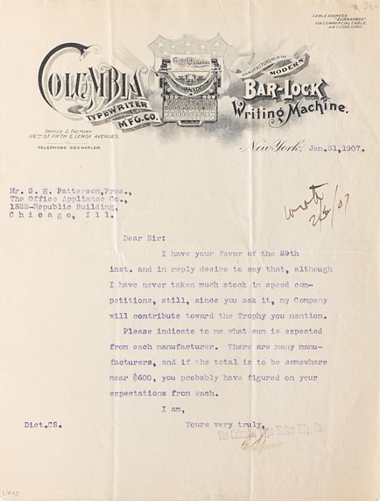 Brief der Columbia Typewriter Mfg. Co., New York adressiert an Mr. Patterson, Office Appliance Co. Chicago; datiert 31.01.1907 Maschinenschrift, unterschrieben