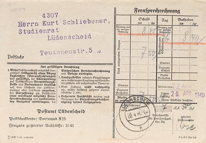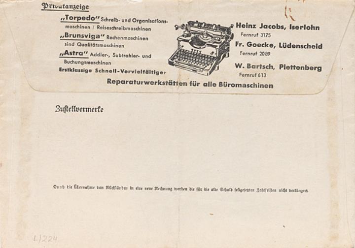 Postsachenumschlag (Fernsprechrechnung) mit rückseitigem Werbedruck für Schreibmaschinen-Reparaturwerkstätten adressiert an Herrn Schliebener, Lüdenscheid; Poststempel Lüdenscheid/20.02.1940