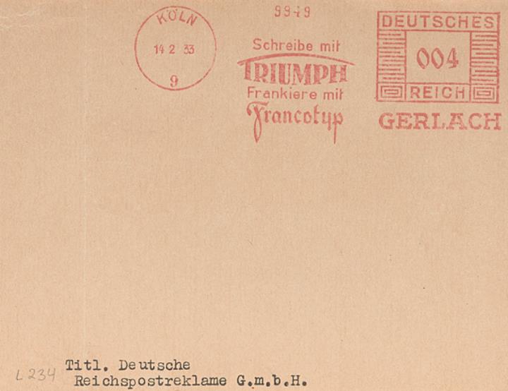 Vorderseite eines Briefumschlags mit Absenderfreistempel der Triumph-Werke Nürnberg; Nr. 9949 adressiert (Maschinenschrift) an Titl. Deutsche Reichspostreklame GbmH Stempel: Köln/14.02.1933, Werbung Triumph, Wert Deutsches Reich 4 RPf.