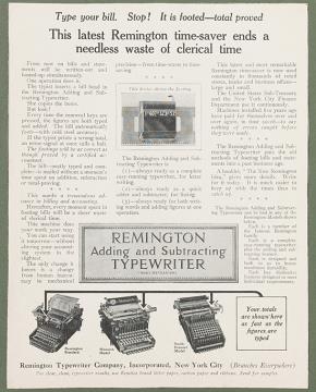 Werbeanzeige für Schreib- und Buchungsmaschinen Remington; auf Karton geklebt monochrom