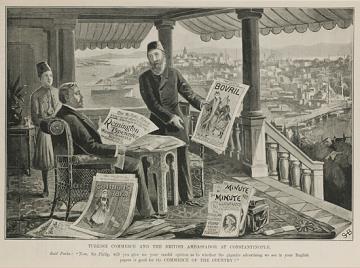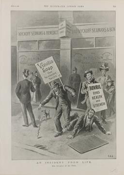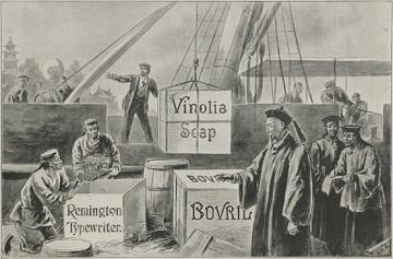 Zeitungsblatt (The Illustrated London News) mit Werbeanzeige für verschiedene Produkte u. a. Schreibmaschine Remington monochrom; Grafik: Monogramm S.H.B.