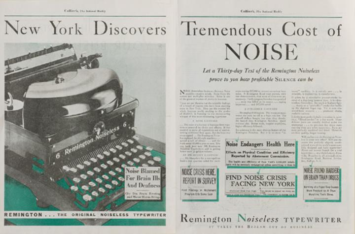 zweiseitige Werbeanzeige für Schreibmaschine Remington Noiseless 6 polychrom