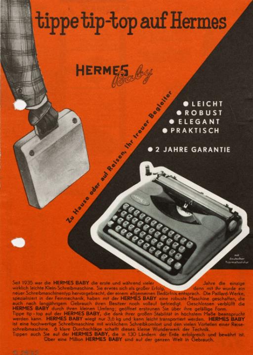 Prospekt für Schreibmaschine Hermes Baby Zu Hause oder auf Reisen, Ihr treuer Begleiter