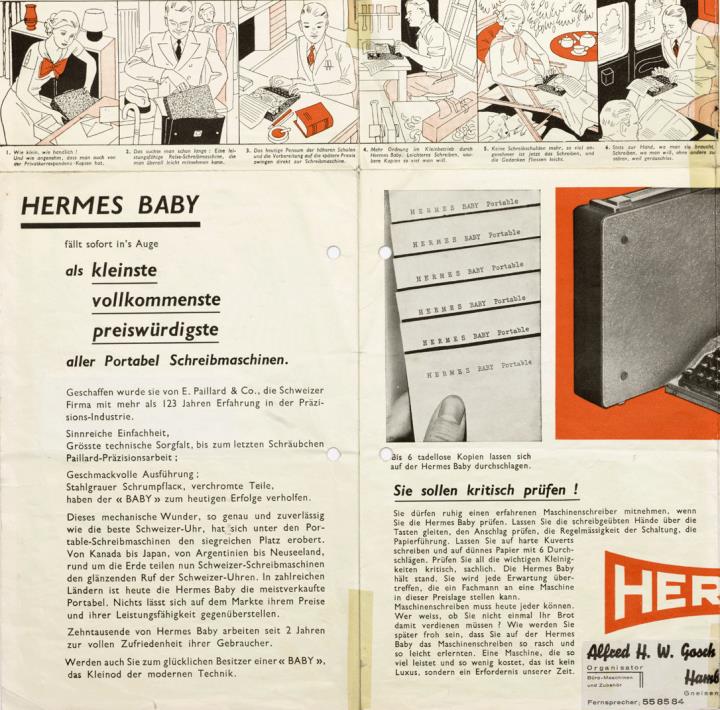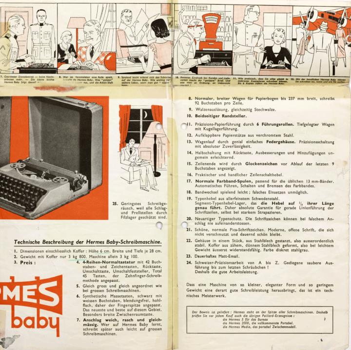 Faltprospekt für Schreibmaschine Hermes baby Nr. 101.b III-37 All.8.000 I.R.L.