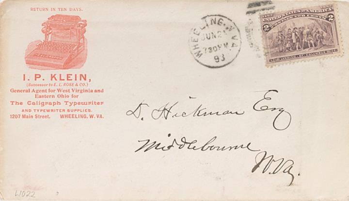 Briefumschlag mit Firmendruck der Schreibmaschinenhandlung I. P. Klein, Wheeling adressiert (Handschrift) an D. Hickman Esq., Middlebourne; Briefmarke U.S. Postage 2 Cents; Poststempel Wheeling/Jun 2 1883