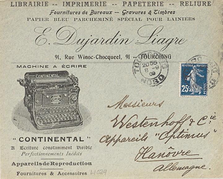 Briefumschlag mit Firmendruck des Bürowarenhandlung E. Dujardin Liagre, Tourcoing adressiert (Handschrift) an Monsieurs Westenhoff & Cie, Hannover; Briefmarke Postes Francaises 25c; Poststempel Tourcoing/8 -9 09