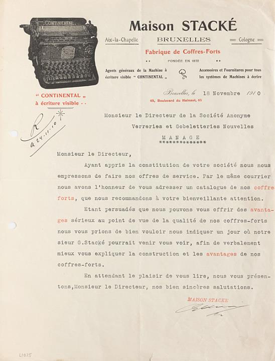 Begleitbrief zu Katalog der Schreibmaschinenhandlung Maison Stacké, Brüssel adressiert an Monsieur le Directeur de la Société Anonyme Verreries [...], Manage; datiert 18.11.1910 Maschinenschrift, unterschrieben; Briefbogen mit Wasserzeichen "Agathon"