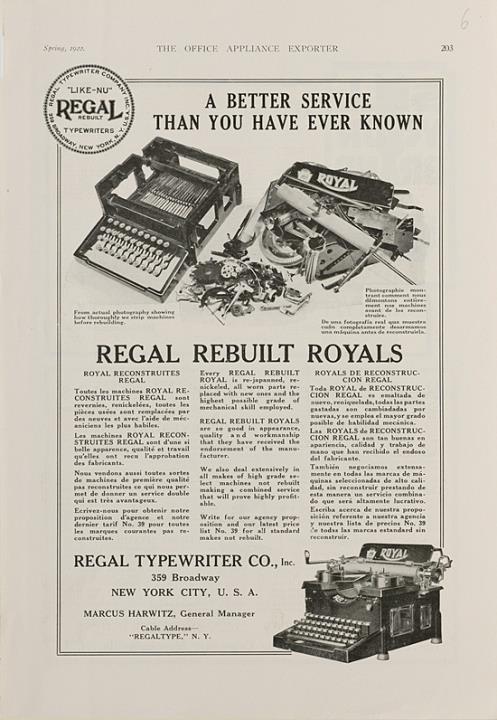 Zeitschriftenblatt mit Werbeanzeige für Schreibmaschine Regal Rebuilt Royal monochrom