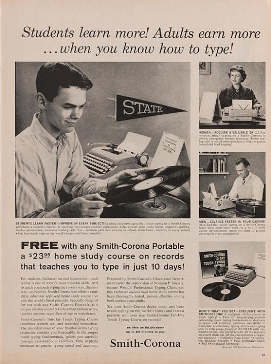 Werbeanzeige für Schreibmaschine und Schreibmaschinenkurs Smith-Corona monochrom
