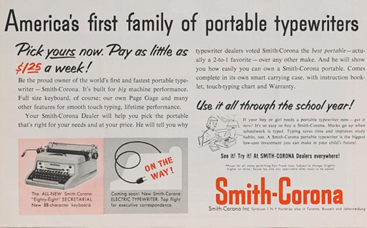 Werbeanzeige für Schreibmaschine Smith-Corona Portable polychrom